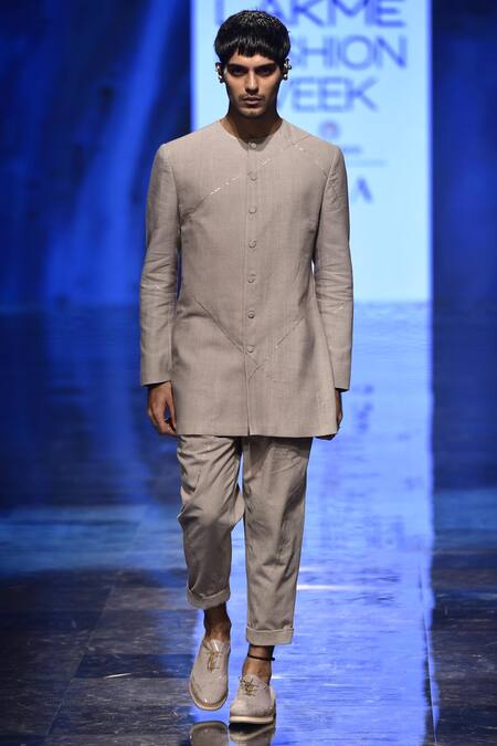 Grey bandhgala with placement hand embroidery & button front detail.