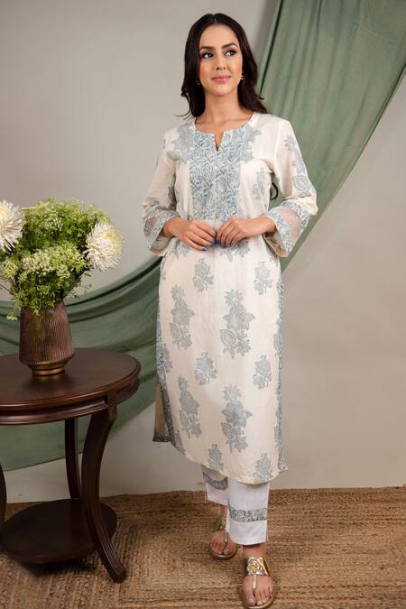 White cotton kurta with blue hand block floral print and sequin embroidery on the sleeve hems.