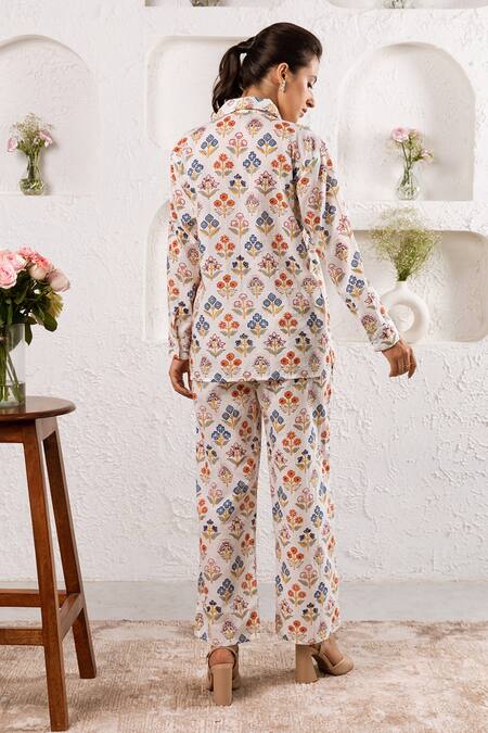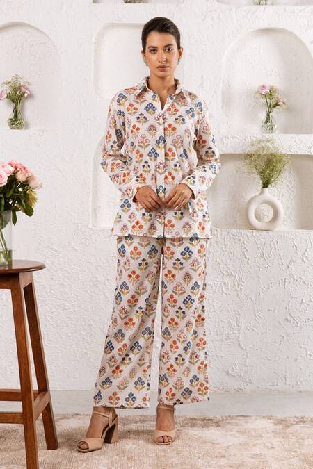 White shirt with multicolor botanical print & front buttons. Paired with printed pant.