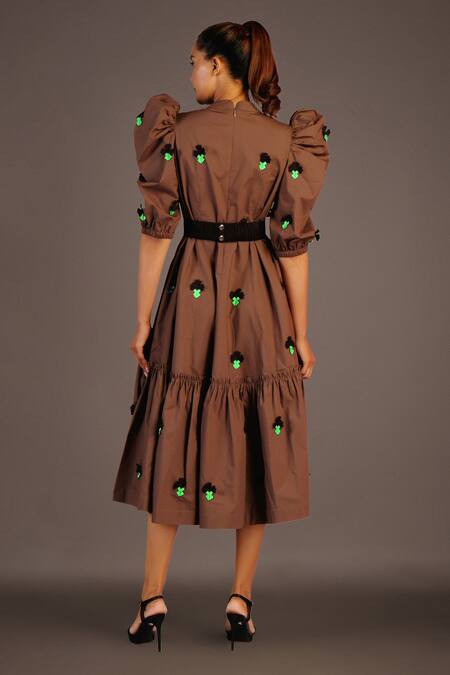 Brown, beige dress with confetti, floral applique placement embroidery & oversized puffed sleeve detailing. Paired with belt.
