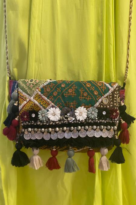 Multi color boho sling bag in cotton base with patchwork details and flower, coin embelishments.