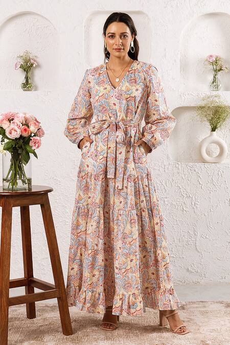 White maxi dress with botanic print, tiered detail & cuff sleeves. Paired with tie-up belt.