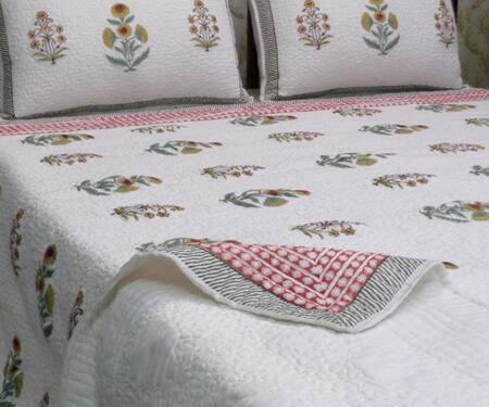 White bedcover in a cotton base with all-over floral hand block print. Comes with 2 matching pillow covers.