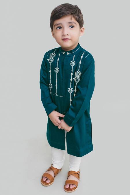 Teal green kurta with placement embroidery. Comes with white pants.