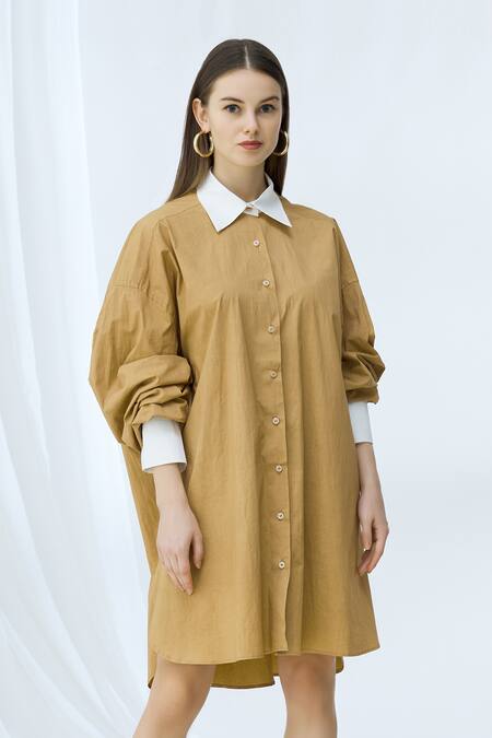 Buy_Deme By Gabriella_Beige Cotton Dress Round, Inner Shirt Stand Collar _Online_at_Aza_Fashions