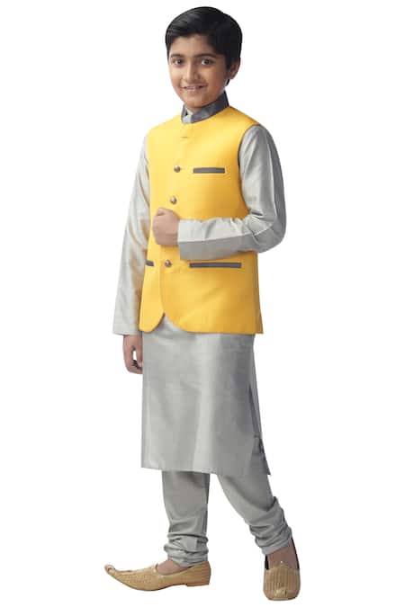 Yellow bundi with grey collar and pocket piping. Paired with a grey cotton silk kurta and pants.