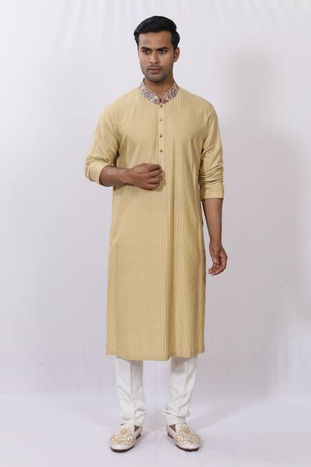 Beige kurta with embroidered collar, pintuck detailing & front buttons.