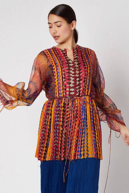 Multi Color Organza, Cotton Silk Notched Printed Tunic
