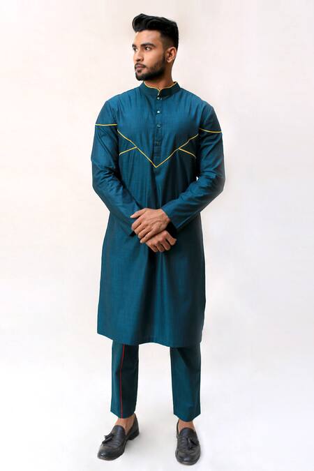 Green straight kurta with contrast piping detail from the back to the front & side slits.