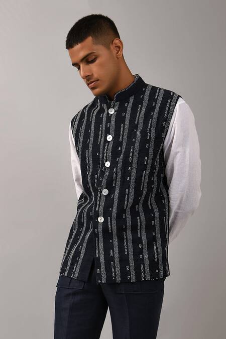 Black bundi with all-over thread work in striped pattern & front button closure.