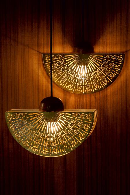 Gold toned metal base pendant hanging cord lamp in semi circle shape with all over vintage pattern jaali work.