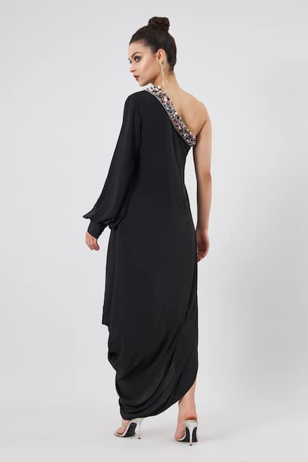 Shop_Aakaar_Black Silk, Crepe Crystals Asymmetric Cowl Draped Dress _Online_at_Aza_Fashions