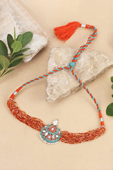 Crescent moon pendant with intricate stone embellishments., Multi beaded chain with a vibrant color mix., Pull-out drawcord for adjustable fit.
