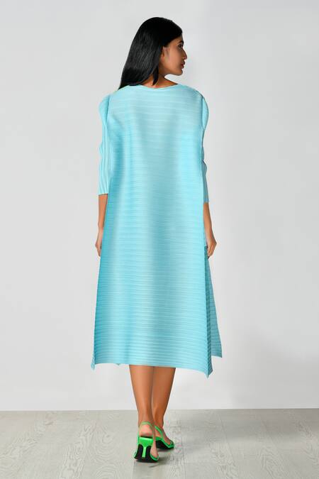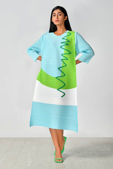 Pleated texture throughout the dress, Unique doodle pattern design, Color-blocked sections in blue and green