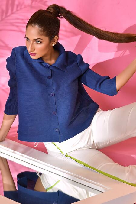 Blue Polyester Collared Pleated Shirt