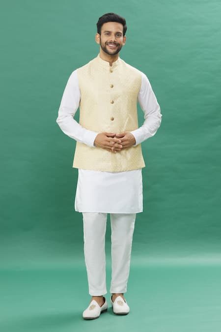 Yellow bundi featuring an all-over criss-cross jacquard pattern and golden buttons. Paired with a white kurta and churidar.