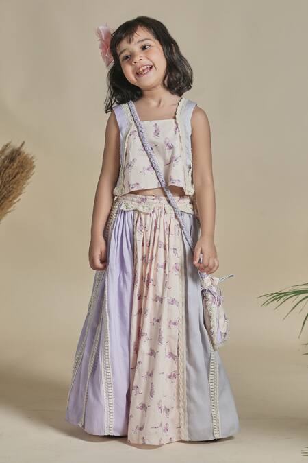 Peach, grey and lavender lehenga featuring crochet lace borders. Paired with a matching top and potli bag.