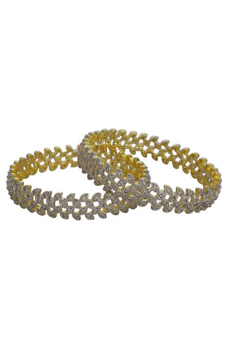 Gold and silver toned bangles featuring intricate cutwork with leaf crystal motifs. Made from a metal alloy and adorned with diamond stones.