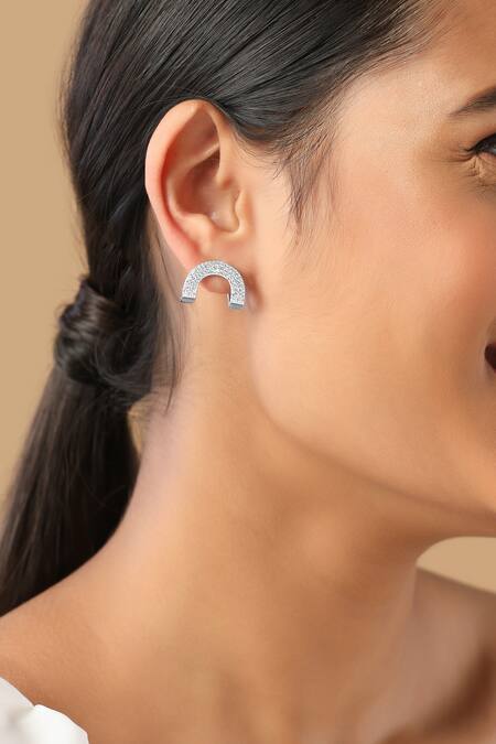 Silver ear cuffs featuring arc shaped cut work details and studded cubic zirconia