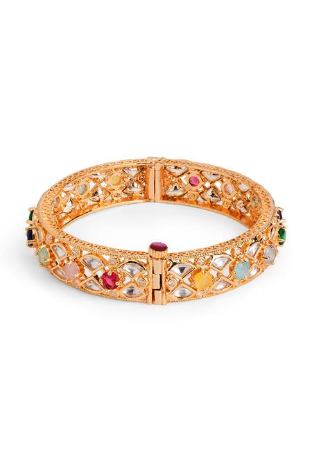 Gold bangle featuring multicolour gemstone and stone embellishments in a floral pattern