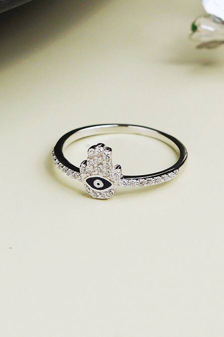 925 silver toned band ring featuring blue evil eye enamel and hamsa cut work details