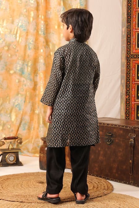 Black kurta featuring abstract printed panels with gota and marodi hand embroidery. Paired with a matching churidar for a complete look.