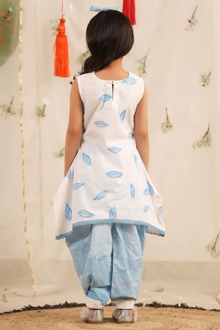 White kurta featuring contrast blue leaf prints and lace trims. Paired with contrast blue brush paint pattern dhoti pant.