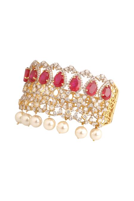 Gold-tone bangle with cutwork detail, encrusted cubic zirconia stones - hydro rubies & shell pearl drops.