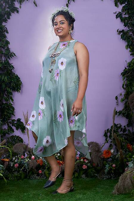 Grey sleeveless handkerchief dress crafted from upada silk featuring a daisy print
