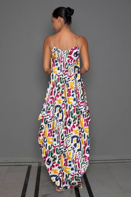 White damask print scarf dress, with asymmetric pattern and V neck with noodle strap detailing in cotton silk fabric.