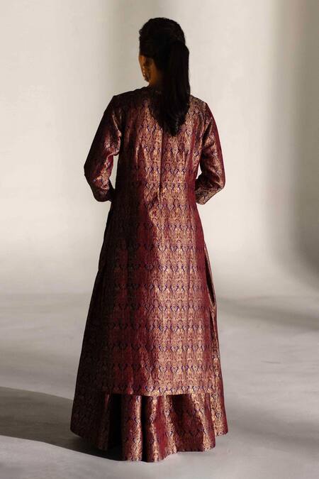 Wine kurta featuring a round neckline and long sleeves in handloom brocade silk. Paired with a floral patterned gharara and a contrast embroidered border scallop dupatta.