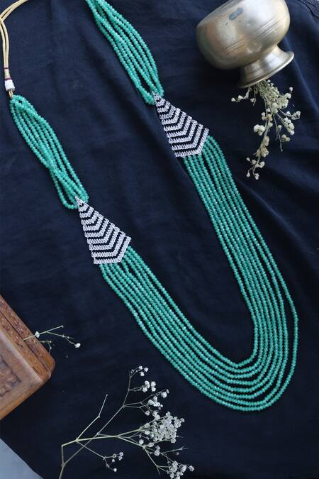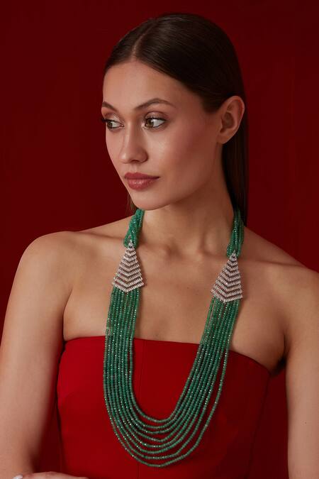 Rhodium plated long multi-layered necklace with geometric motifs of faux diamonds and green onyx beads.