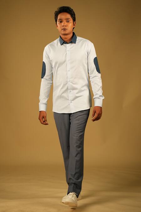 Blue shirt with contrast collar and patches on the elbow.