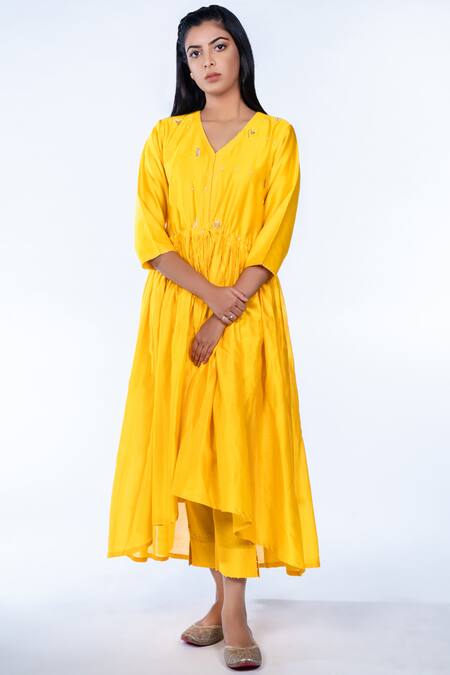 Yellow asymmetric kurta with zari embellished on yoke. Comes with pants.