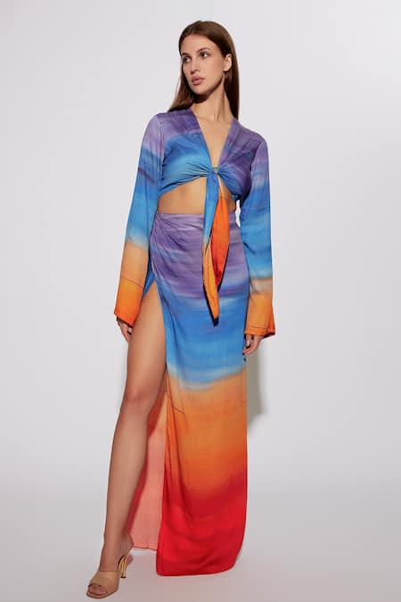 Multi color top featuring a V neck and tie-up details, complemented by a side slit skirt. The outfit is crafted from Touchfeel Satin with full sleeves and an abstract design.