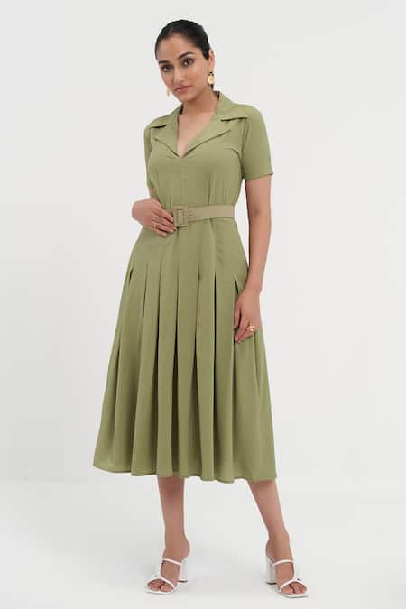 Buy_Detales_Green Textured Crepe Plain Notched Spread Collar Jane Box Pleated Shirt Dress_at_Aza_Fashions