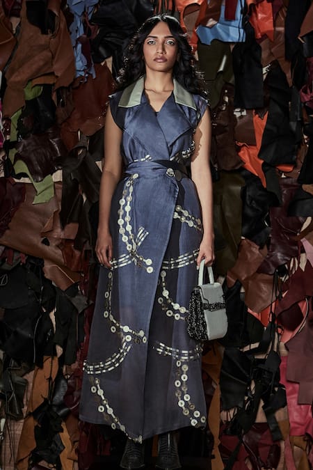 Buy_Devina Juneja_Grey Thick Organza Leather Lapel Collar Astoria Sleeveless Trench Dress_at_Aza_Fashions