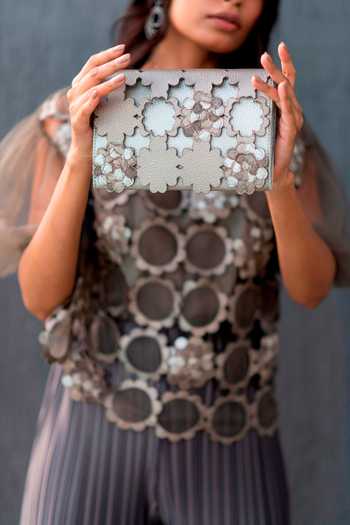 Gunmetal clutch featuring floral applique motifs and laser cut detail