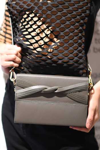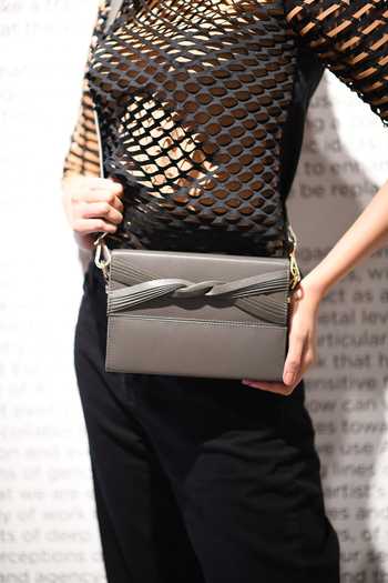 Grey leather clutch featuring a twisted bow detail and velvet lining