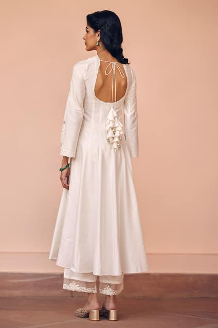 Ivory embroidered anarkali featuring exquisite thread embroidery on the neckline and sleeves with cutwork details. Paired with an embroidered shantoon palazzo and an intricately embroidered organza dupatta.