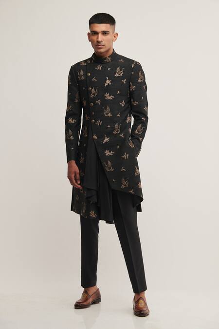 Black Silk Bird, Floral Draped Sherwani Set