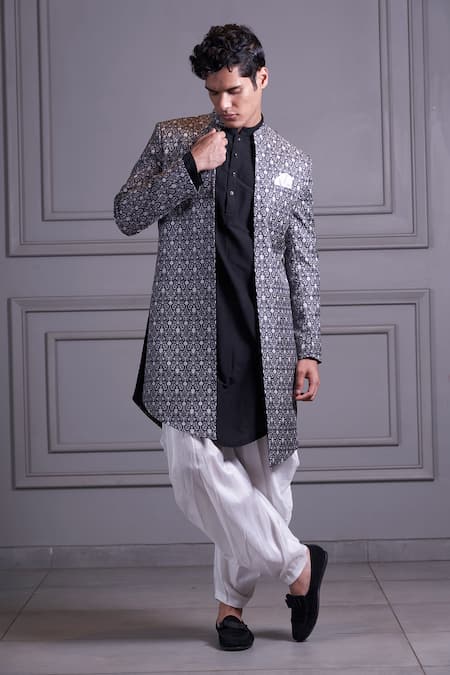 Grey, black achkan with digital print floral motifs and welt pocket in front. Comes with black kurta and white dhoti pant.