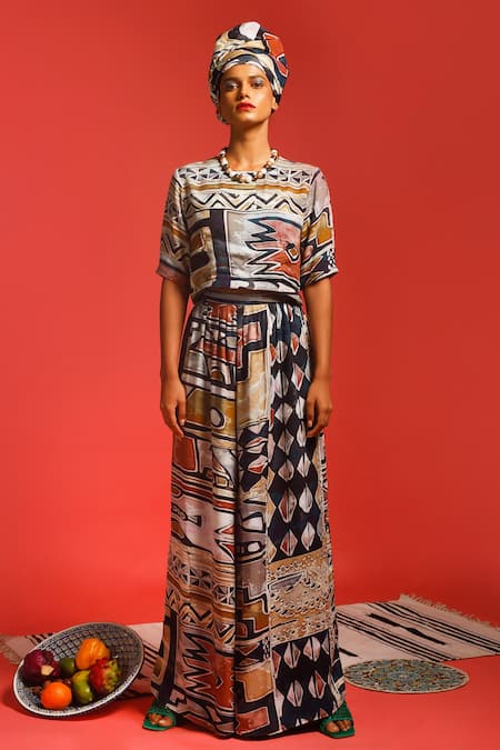 Multi-colored natural crepe crop top with digital print and hand embroidery. Comes with pant.