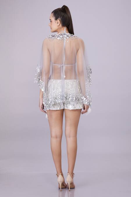 Grey Net Embroidery Crystal V Neck Flower Sequin Sheer Kaftan