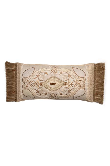 Cream quilted rectangle accent cushion over embroidered, appliqued baroque Persian patterns & fringed border.