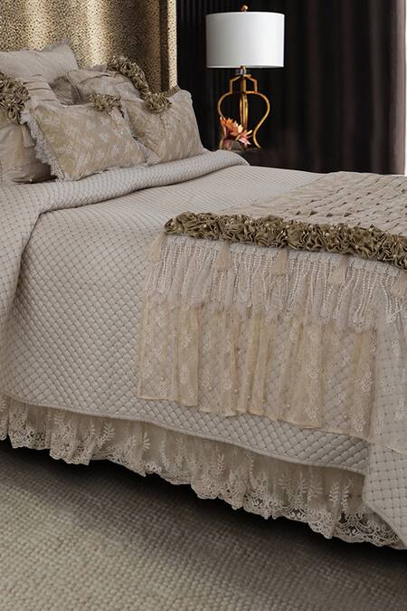 Buy_Diva Riche_Gold Washable Silk Floral Applique, Thread Roset And Work Bedding_at_Aza_Fashions