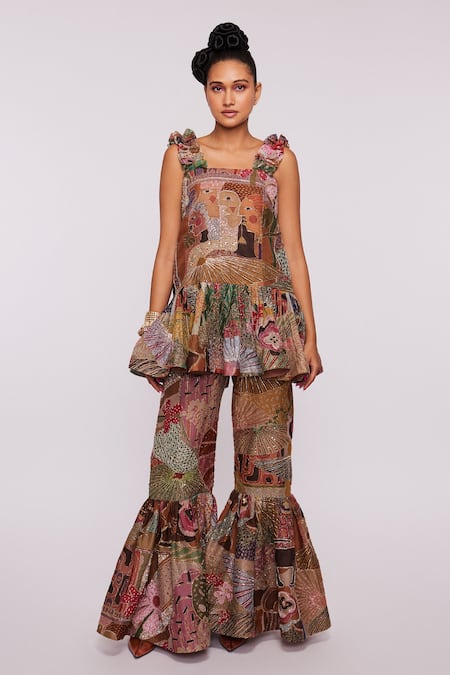 Yellow ruffled tunic with divergence print & metallic embellishments. Paired with embellished, printed sharara & dupatta.
