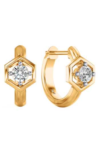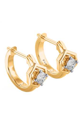18kt yellow gold hoops featuring solitaire diamond embellishments. Each hoop is adorned with round-cut diamonds in a unique hexagonal setting.
