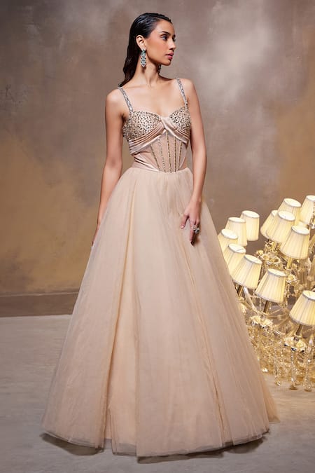 Beige Tulle Mesh Embellished Crystals Sweetheart Bella Bodice Corset Gown