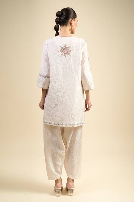 Cream straight kurta featuring a round neckline and three-quarter sleeves. Paired with matching salwar pants with pleated detailing.